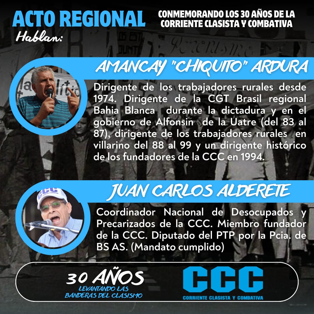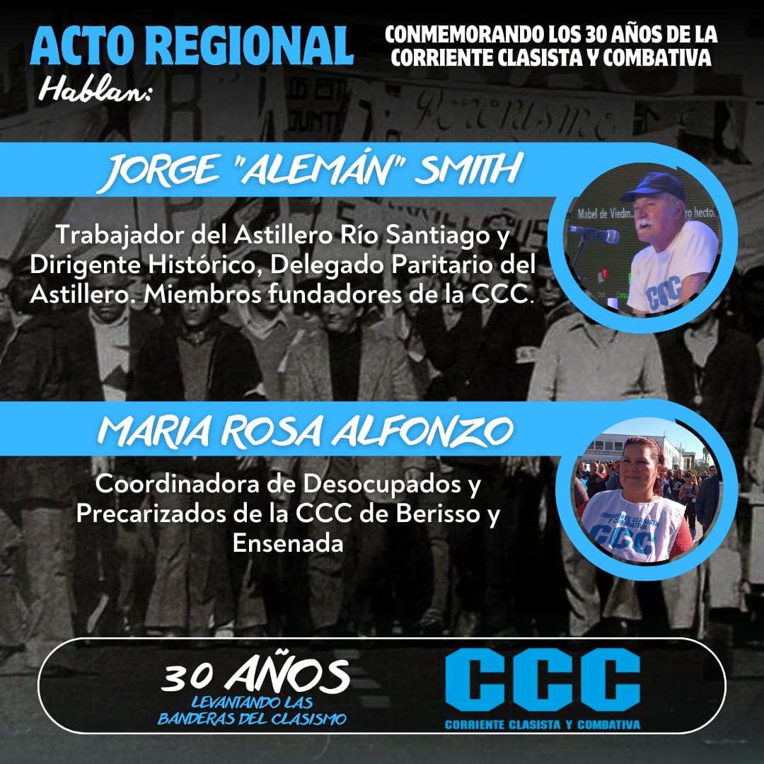 En el marco de la conmemoración de las tres décadas de historia de nuestra gloriosa Corriente Clasista y Combativa (CCC), este 27 de noviembre a las 18 horas, los invitamos al Salón Malvinas de Ensenada (La Merced 133) para participar del acto regional por los 30 años de la CCC. Una jornada para levantar, una vez más, las banderas del clasismo y reafirmar nuestra lucha por una patria libre, justa y soberana.