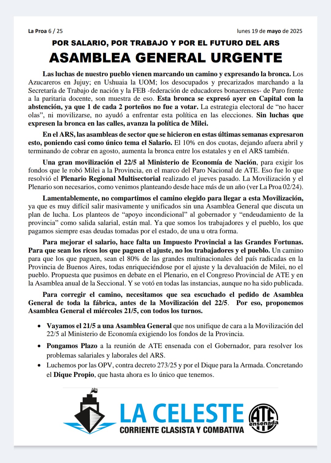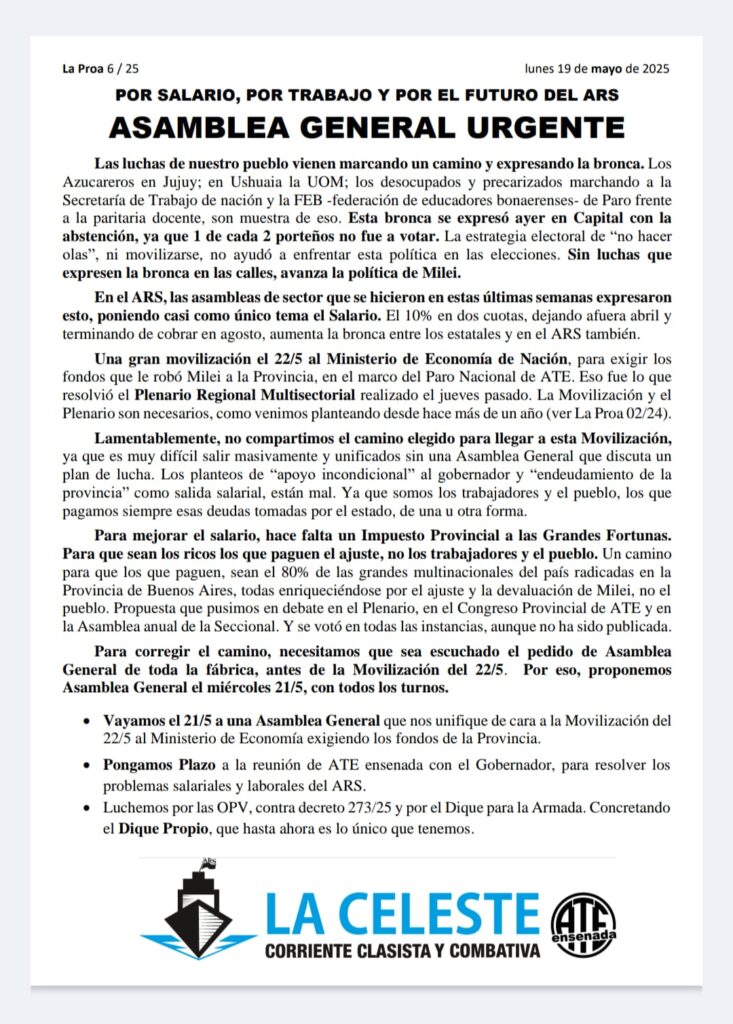 Ensenada, lunes 19 de mayo de 2025 – La situación social y económica del país sigue generando un creciente malestar entre trabajadores de distintos sectores. En este contexto, llamamos a que se convoque en el Astillero Río Santiago (ARS) a una Asamblea General urgente para este miércoles 21 de mayo, con el objetivo de unificar fuerzas de cara a la gran movilización prevista para el día siguiente, jueves 22, hacia el Ministerio de Economía de la Nación.